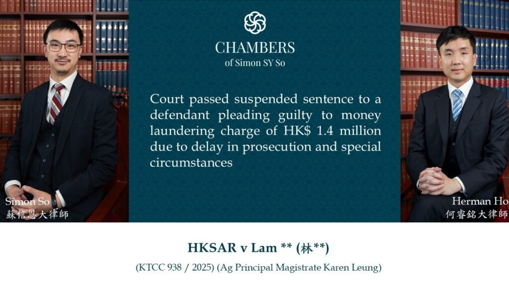 Court passed suspended sentence to a defendant pleading guilty to money laundering charge of HK$ 1.4 million due to delay in prosecution and special circumstances